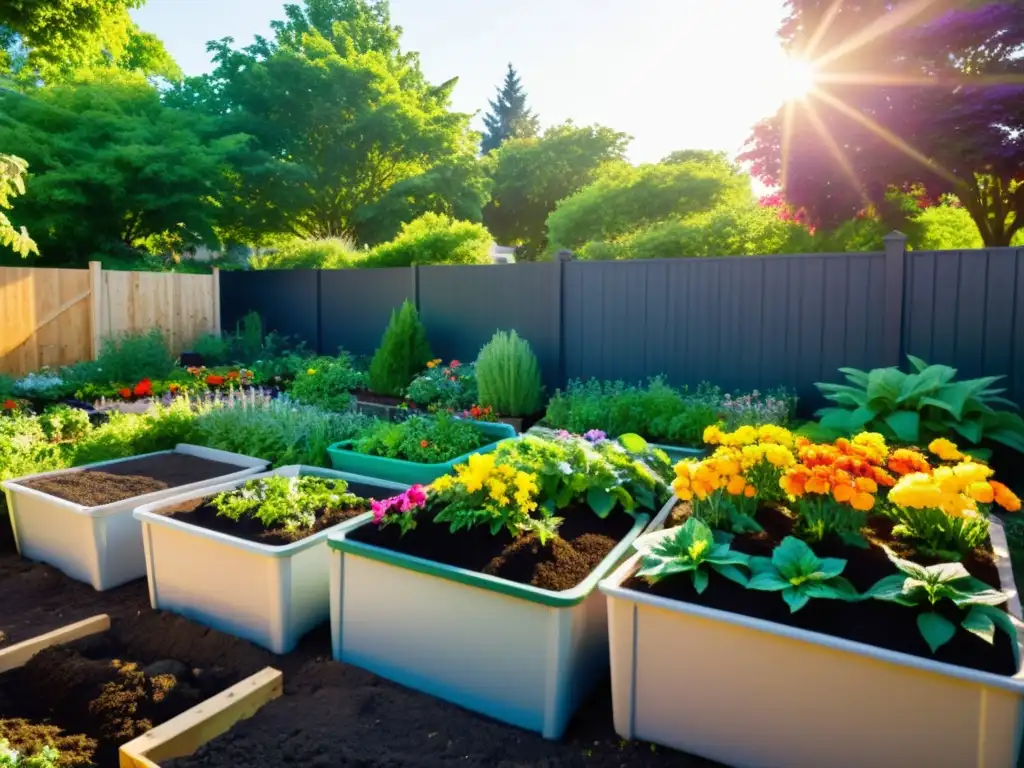 Un jardín comunitario vibrante con diversas áreas de compostaje, rodeado de exuberante vegetación y flores coloridas
